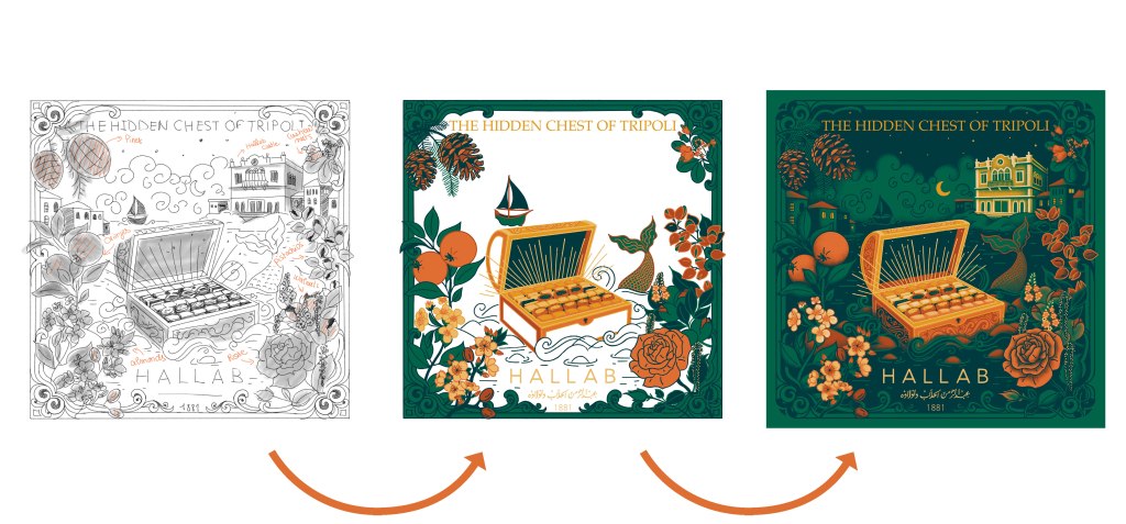 I wanted to illustrate the story of the hidden chest by making the chest the central element, filled with baklava, and with “Kasr El Helou” in the background. The scene is surrounded by detailed elements representing Hallab’s flavors: almonds, pistachios, walnuts, pine nuts, rose, orange blossom, and cashews. A mermaid and a boat are subtly integrated to add a sense of mystery. The overall ambiance aims to evoke luxury, storytelling and richness of flavor.