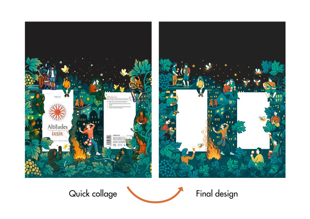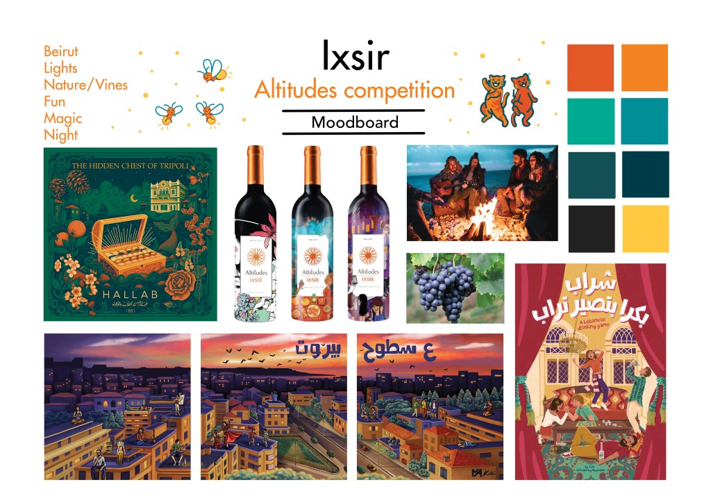 I wanted to include people, because Beirut is Beirut through its people. Lights and hope are everywhere: from the windows’ lights, the stars in the sky, and the fireflies. Inspired by my artwork On Beirut’s Rooftops, I added figures on the roofs, along with natural elements and a campfire, reminding us of the times when we’re in the mountains searching for Beirut from far away. I also loved how old Ixsir editions extended the design onto the label, so I used that idea.