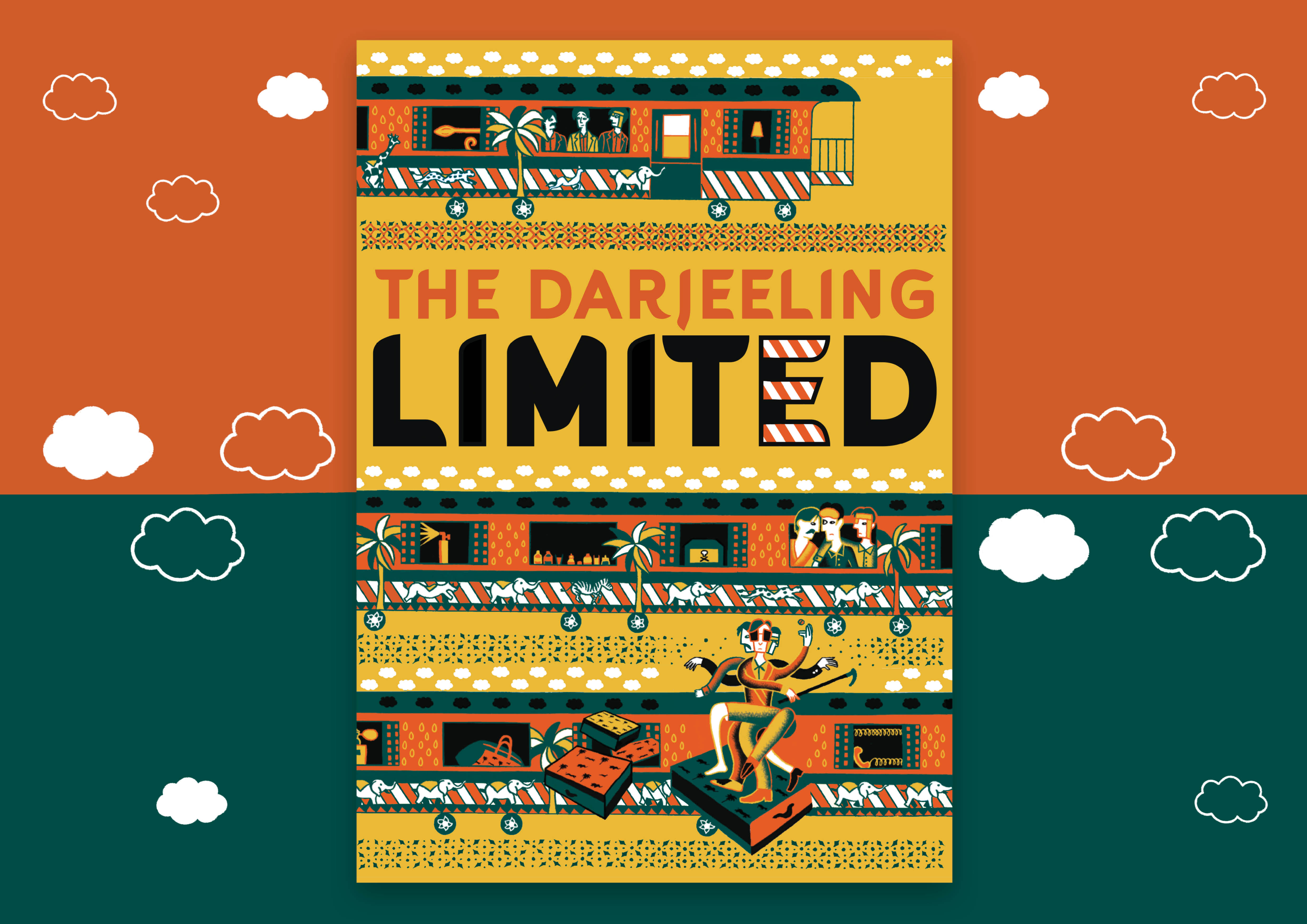This movie poster was inspired by Wes Anderson’s movie The Darjeeling Limited. The train, dominating the composition, symbolizes the journey of the three characters. Elements from the film appear throughout, some placed in hidden spots, and the colors are, of course, inspired by the Indian flag. The poster is part of a series created by reworking illustrations from my book Sur ta Fin, which explores movies through visual and written interpretations. I adapted these illustrations into standalone visuals, presenting them in new graphic composition contexts.
