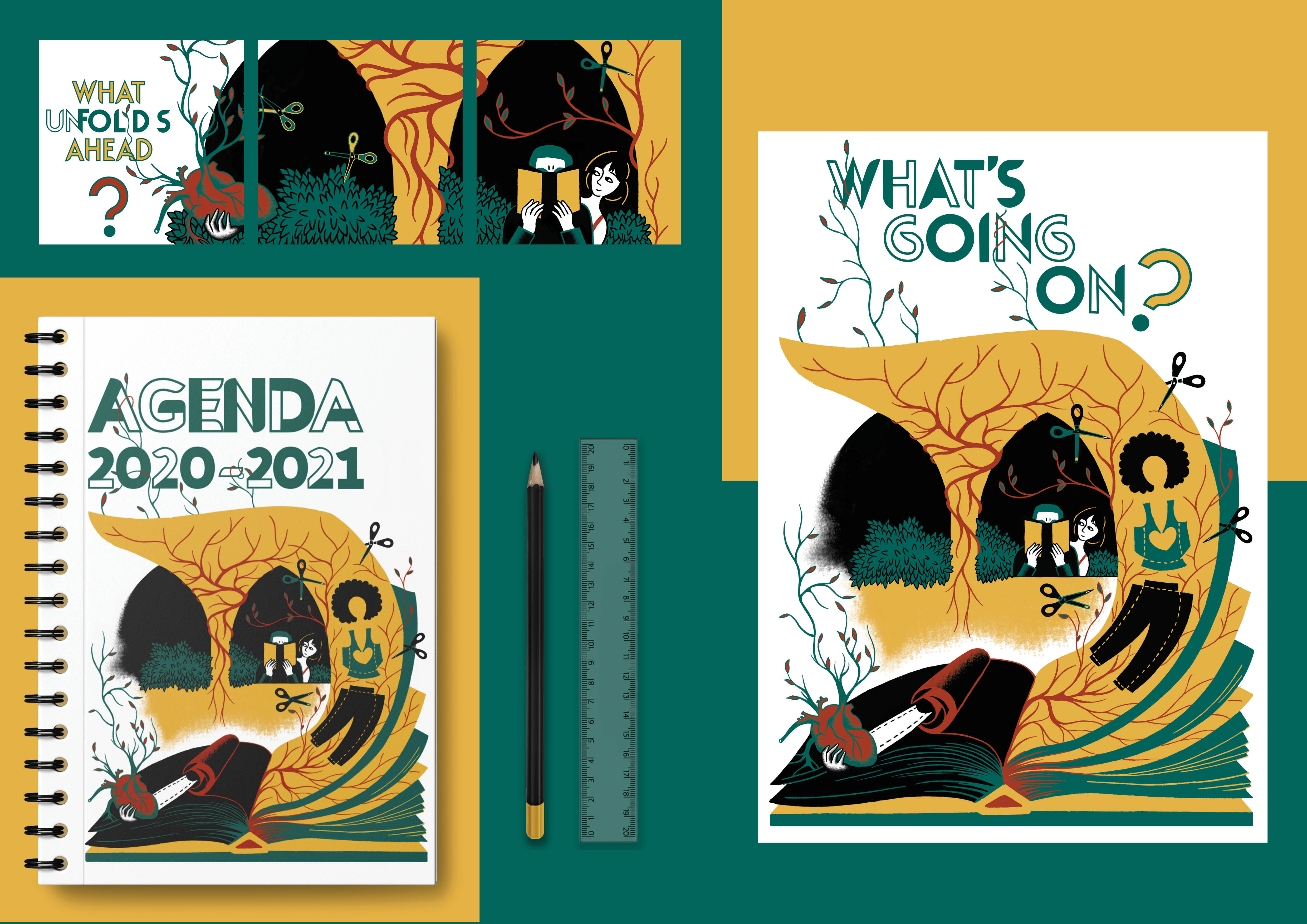My former university wanted to feature one of my illustrations on the cover of their agenda, and I selected What’s Going On?, inspired by Jocelyn Saab‘s film of the same name. The illustration, with its central book, symbolizes study and knowledge while also hinting at time passing by and the unexpected. What’s going on… and what will unfold this year?