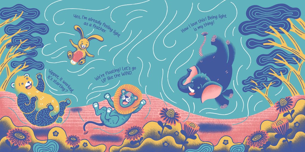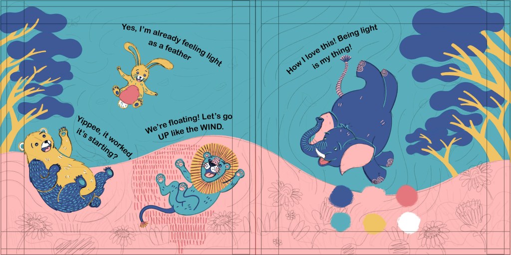 In Winding Up, we have four main characters: a bear, a rabbit, an elephant and a lion, they are cute and full of energy. Throughout the story, they dance, fly, relax, but also get a little bored. Fernanda, the writer, gave me a lot of creative freedom, and I chose a character style that I love but that also aligns with the latest trends in the European children’s book market. I used rounded, flowy shapes that are clean and dynamic, along with playful patterns that add fun and contrast. I wanted the overall feel to be simple, yet thoughtfully designed and visually unique.