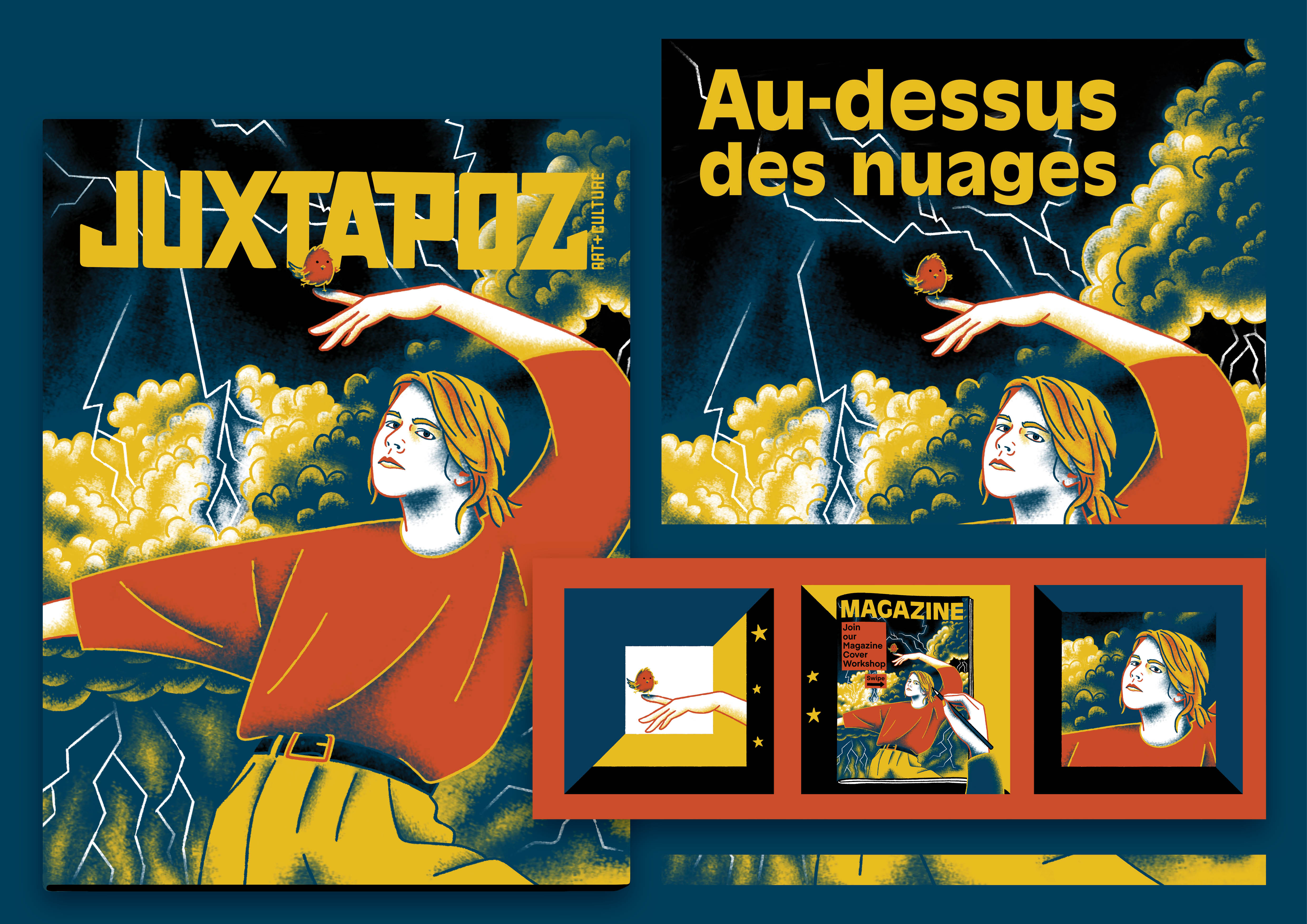 I created Zaho de Sagazan‘s portrait for a workshop about portraits for magazine covers at La Maison des Artistes Gallery in Beirut. Having worked for years with Doesn’t Square Studio who does among other things portraits, a lot of them for magazines, I gathered insights from my experience and created a workshop to share it with people who were interested in this specific field. In a few words: capturing the personality of the subject through facial traits, position, style, and colors is key. Equally important is considering composition: where the title goes, how to frame the subject, and creating a background that complements without overpowering. Adding meaningful details is always a plus: like the bird here (in Zaho’s famous song “La symphonie des éclairs”, she says “si j’étais un oiseau, j’irais danser sous l’orage” which means “if I were a bird, I would dance in the storm”.)